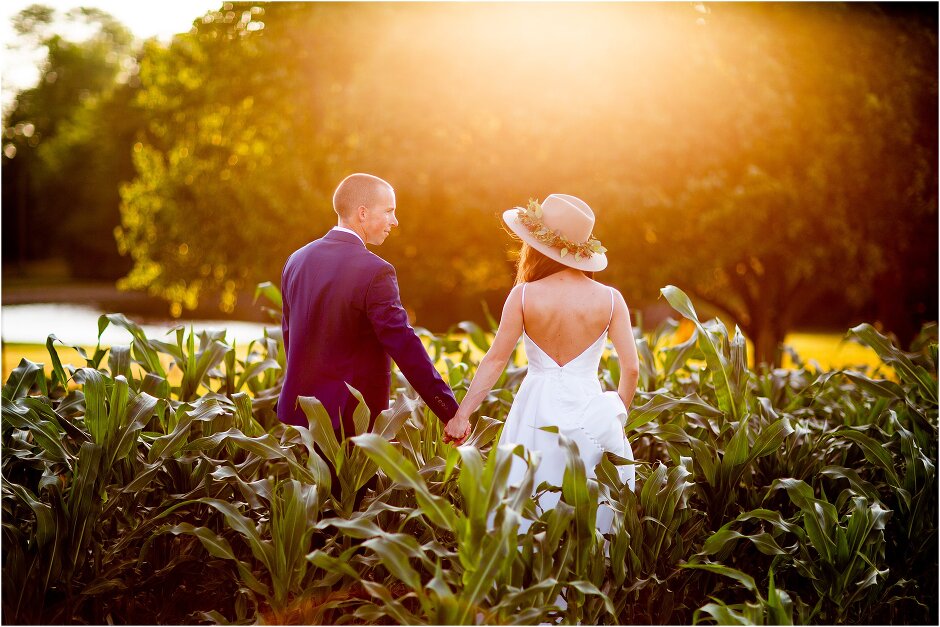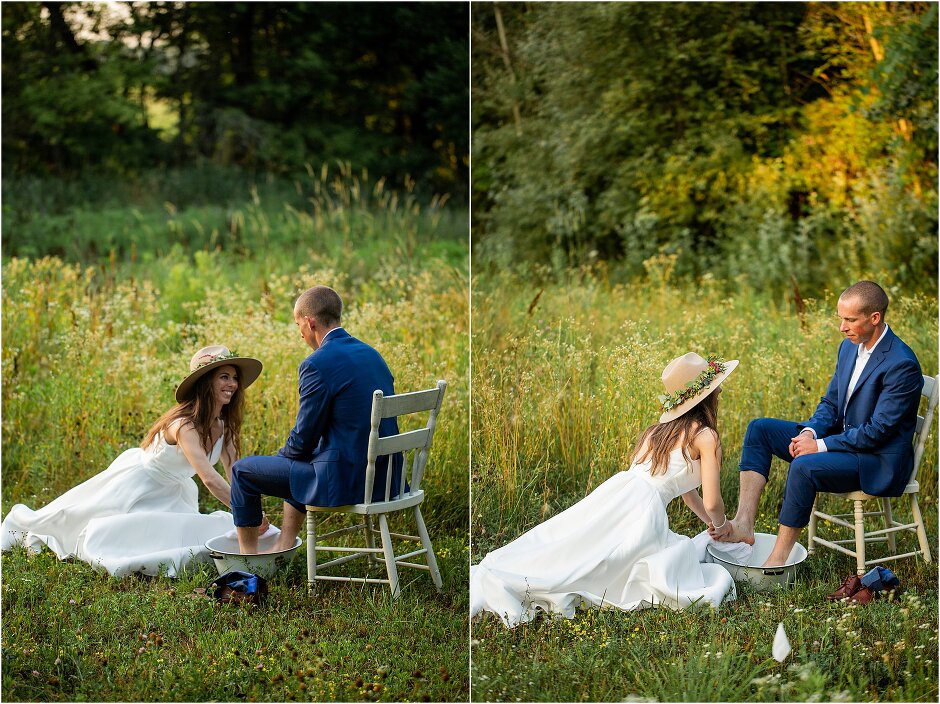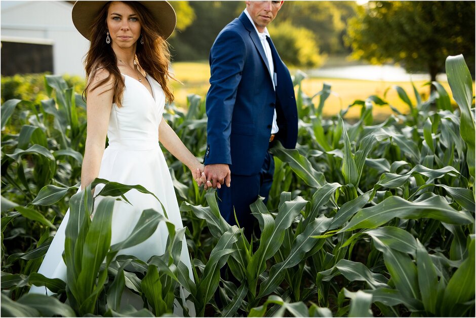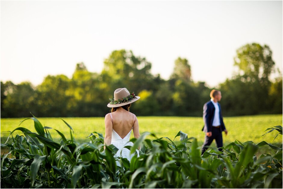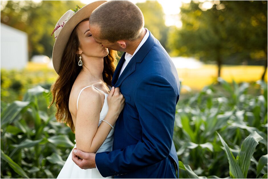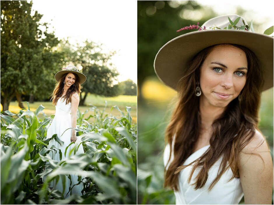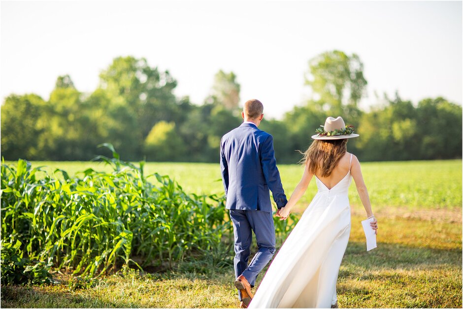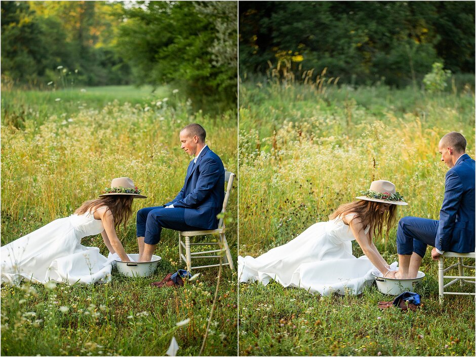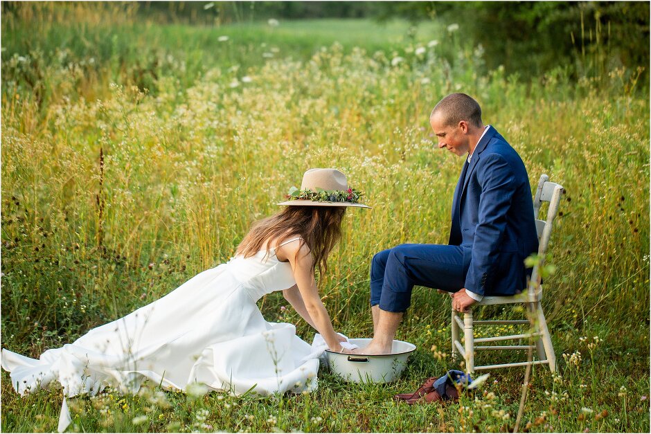 As mentioned above, Justin & I started our wedding off with a sunrise first look. My matron of honor, McKenzie was a complete gems as she got up to help me get ready at 4 AM! Did I mentioned she found out she was pregnant a couple months before our wedding? Just adding to the story line 😉 A huge shoutout to our vendors, Hannah, Jer, and Ashley for even being willing to capture all of this at such an hour. We went to our videographer’s house that was nearby for the first look. She had a garden, which is like a sanctuary for me & you will see so many of those photos ! Justin, being a farmer, I love that we could get photos in the corn. God is in every detail. He gave us a gorgeous golden hour. During our first look, I washed Justin’s feet as a symbol of humility, mirroring Jesus when he washed the disciples feet. We spent so much time together on our wedding day & it was so special. It was not rushed & it was the best part of the day. AND I got to wear a hat for my first look. I was that bride who had 2 looks & 2 pairs of shoes for her wedding day !